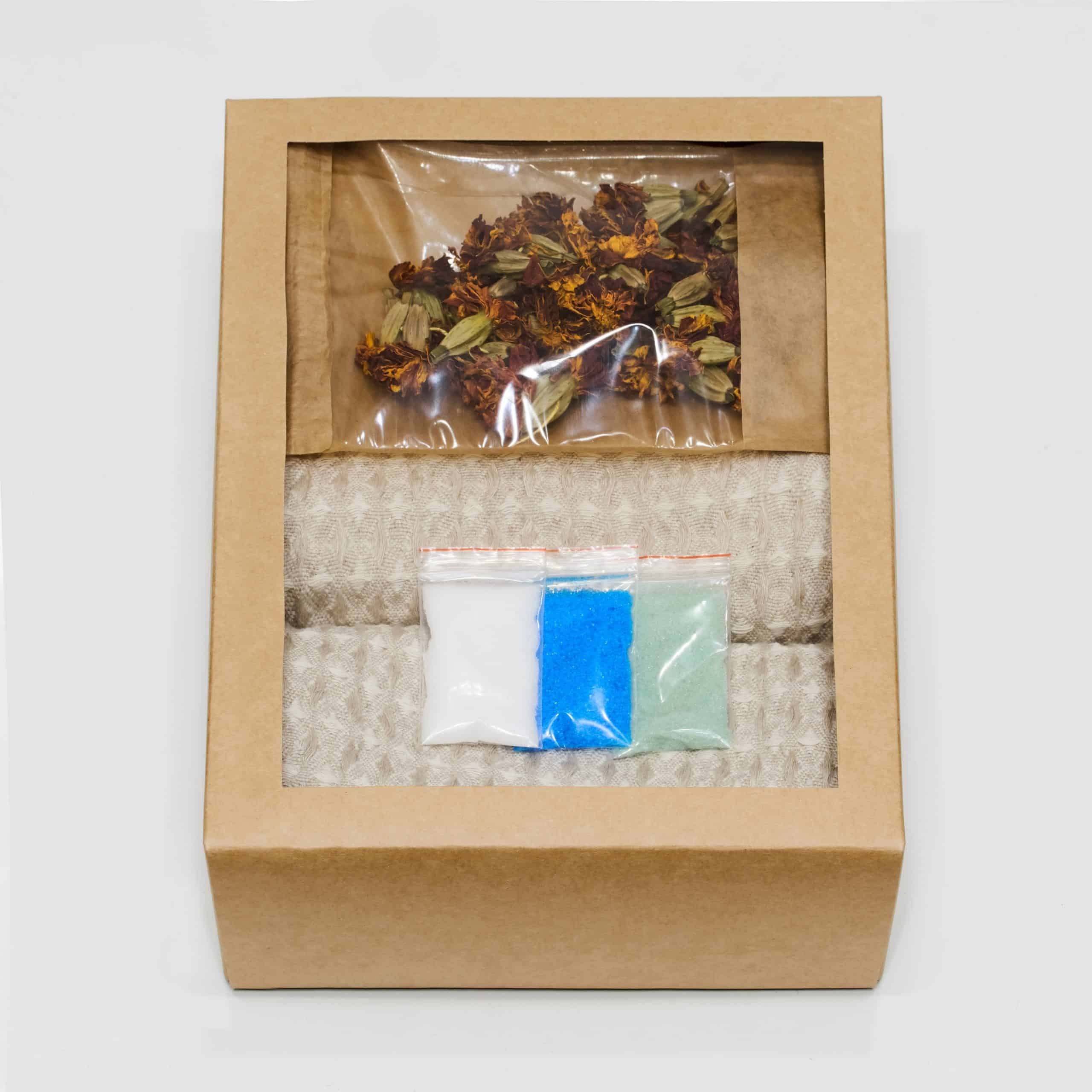 Natūralaus dažymo rinkinys su 3 lininiais pagalvėlių užvalkalais supakuotas dėžutėje, tad puikiai tinka
