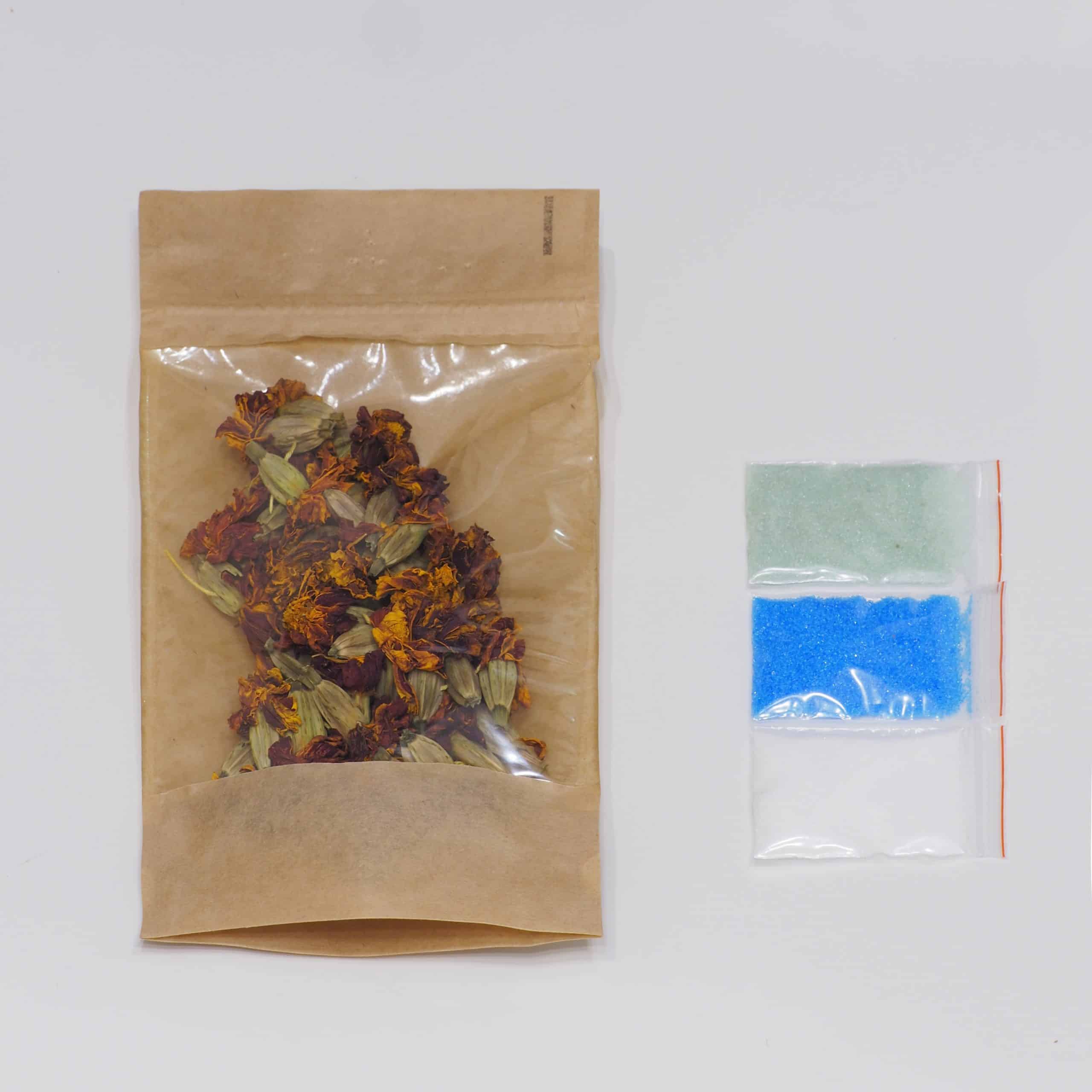 3 kandikai (8 g KAl(SO4)2, 8 g CuSO4, 4 g FeSO4) skirtingoms spalvoms išgauti.