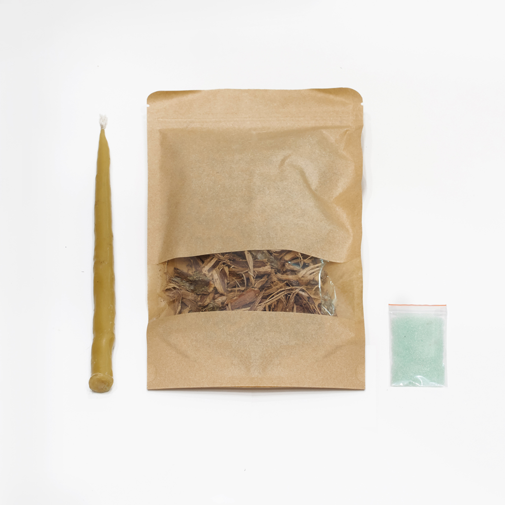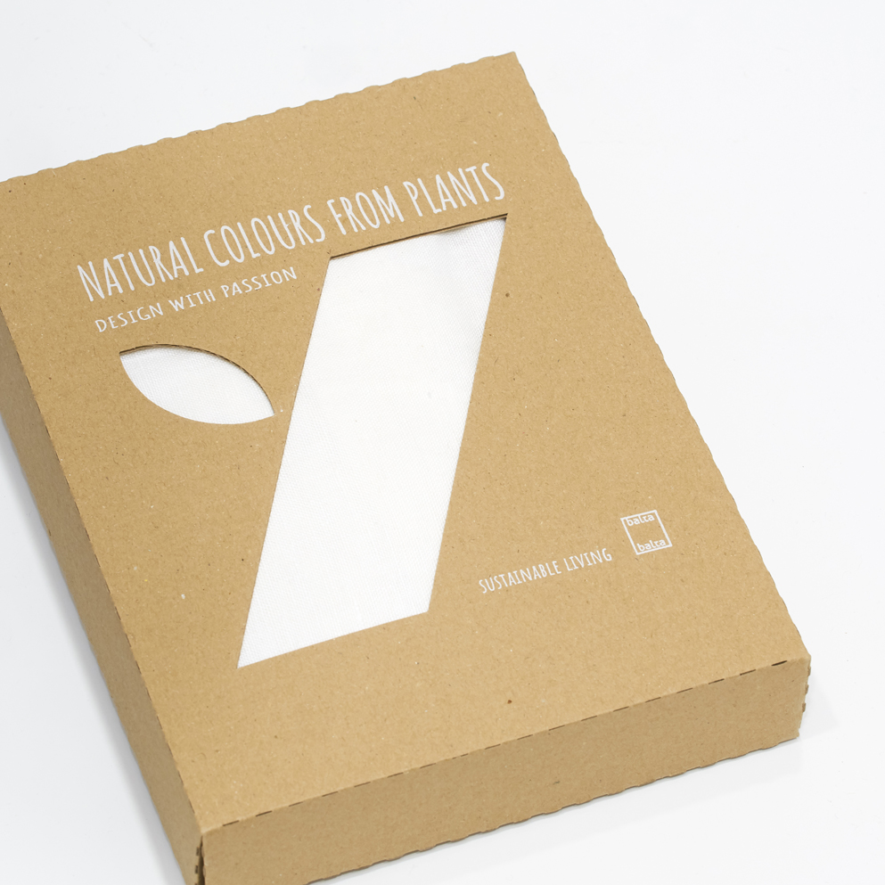 The natural dyeing kit for batik comes with a linen tote bag and includes a linen tote with decorative braided handles (40 x 45 cm), dyeing plant material (100 g of dried oak bark), a beeswax candle (~ 25 cm, 40 g) and a mordant for colour modifications ( 5 g of ferrous sulphate FeSO₄).