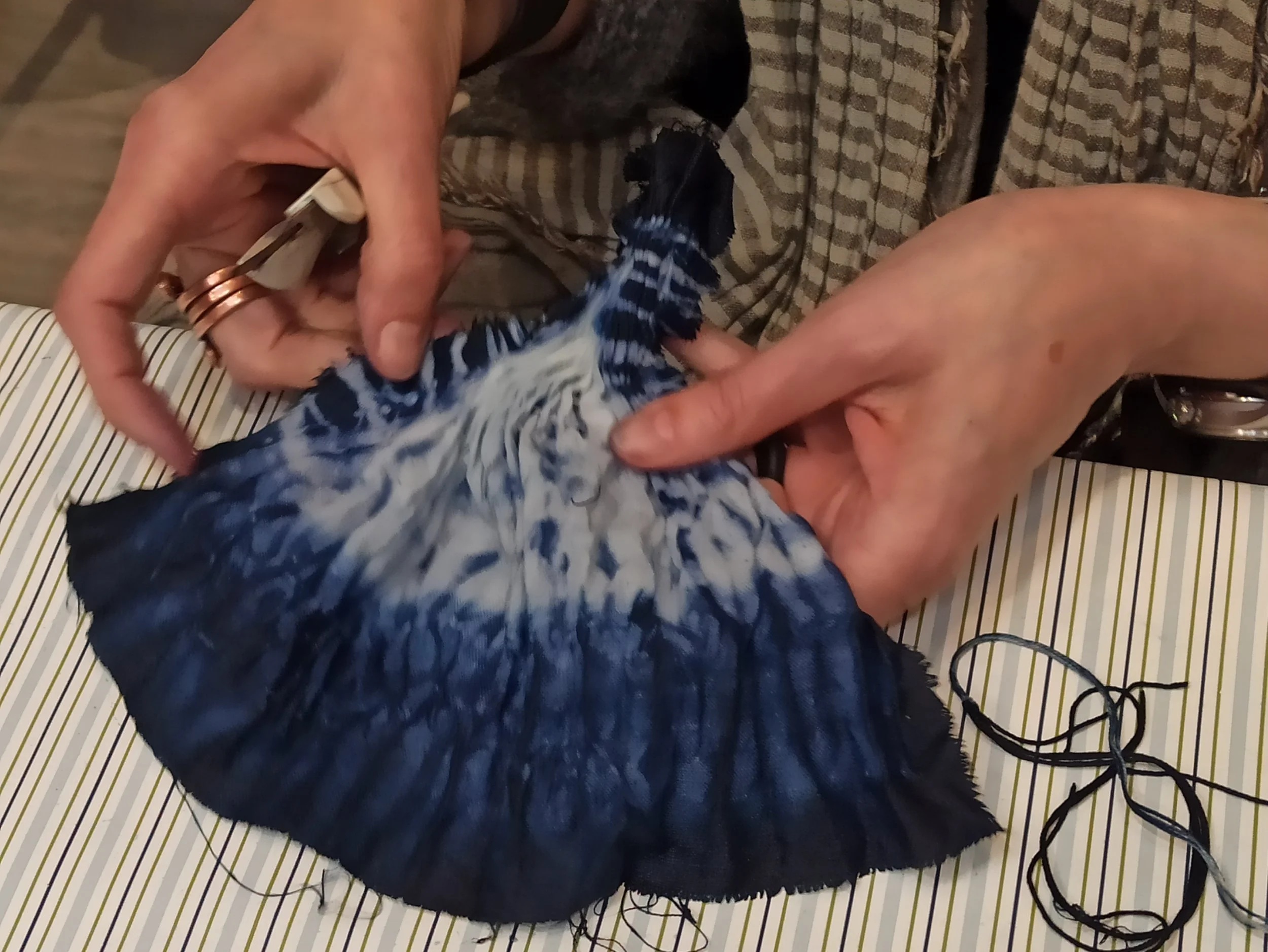 Kūrybinių dirbtuvių metu lankstymo, daigstymo technologija (jap. šibori, plangi) marginamas lininio rankšluostis, šalis arba šilkinė skarelė (pasirinktinai). Naudojamas augalinis nuoviras, fiksuojama kandikais.